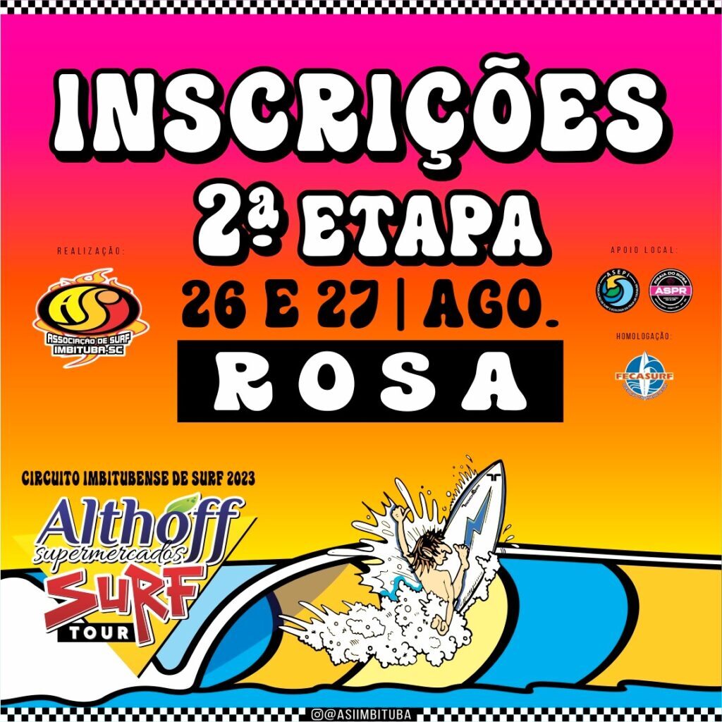 A badalada praia do Rosa, no Bairro Ibiraquera, ao norte de Imbituba, vai receber nos dias 26 e 27 de agosto, a segunda etapa do Althoff Supermercados Surf Tour 2023, assim como aconteceu na primeira etapa, na praia de Itapirubá, é esperado um bom número de inscritos e, mais uma vez, um show de surf dentro d’água e ótima organização fora dela, em mais uma realização da Associação de Surf Imbitubense (ASI).