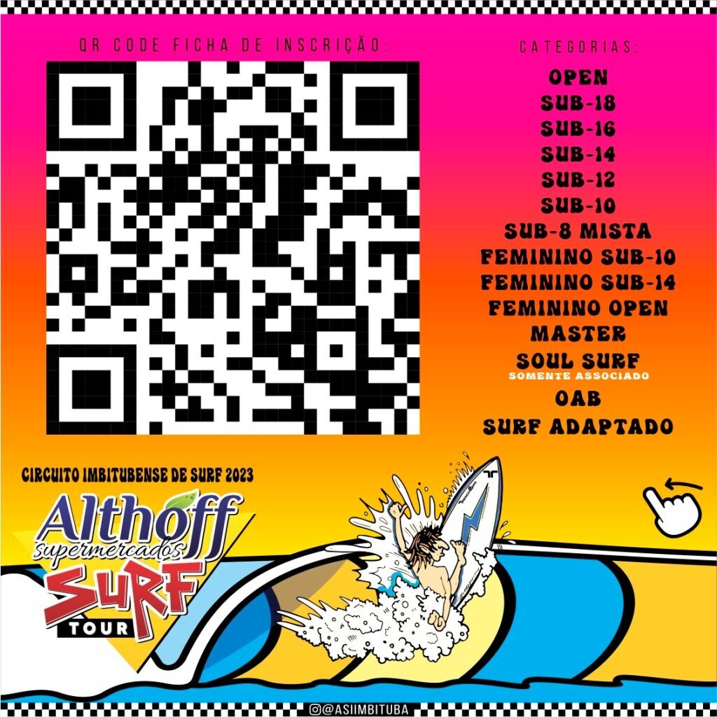 Para disputar o Surf Tour, basta acessar a ficha de inscrição e filiação – clicando aqui – ou através do QR Code disponibilizado pela ASI (acima), preencher os dados, selecionar a categoria que pretende disputar, realizar o pagamento e anexar o comprovante de pagamento.