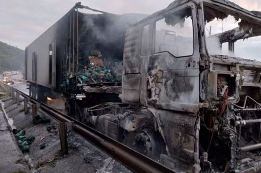 BR-101 é bloqueada e registra fila após caminhão carregado de água sanitária pegar fogo no Morro dos Cavalos, em Palhoça