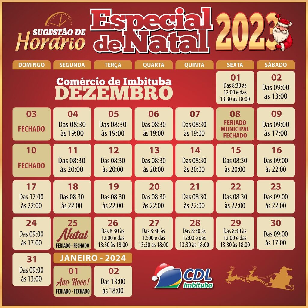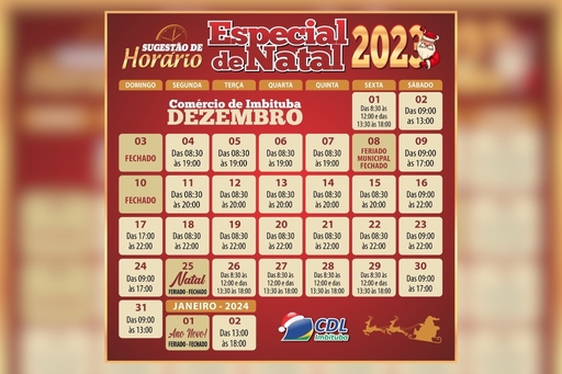 O horário sugerido pela CDL Imbituba inicia já no dia 4 de dezembro, com a ampliação do horário de funcionamento até as 19 horas. Na primeira semana, as lojas que aderirem à proposta estenderão seu expediente até as 19 horas, na segunda semana até as 20 horas, e na terceira semana até as 22 horas.