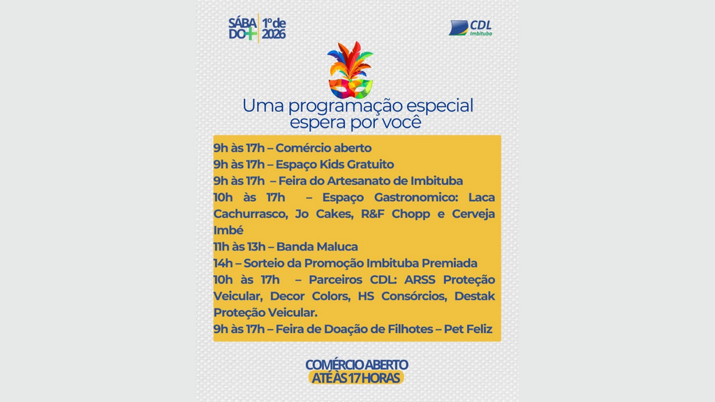 A CDL Imbituba promove no próximo sábado, dia 7 de fevereiro de 2026, a primeira edição do Sábado Mais do ano, com uma programação especial voltada à valorização do comércio local e ao lazer para toda a comunidade