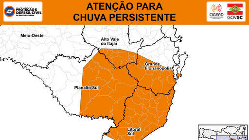 Entre a manhã e à tarde, a influência de uma área de baixa pressão posicionada sobre o Oceano Atlântico deve manter a instabilidade. O sistema favorece a ocorrência de chuva persistente entre a Grande Florianópolis e o Litoral Sul. O risco permanece entre baixo e moderado para alagamentos e enxurradas pontuais nessas áreas.