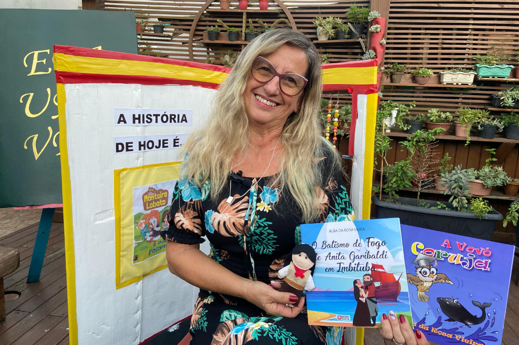 Alba também é escritora e tem dois livros infantis publicados, “A Vovó Coruja” e “O Batismo de Fogo de Anita Garibaldi em Imbituba”.