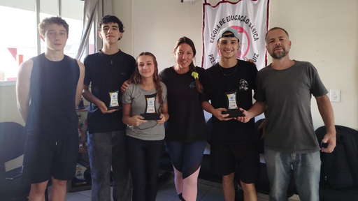 Foto: RSC Portal - EEB Prefeito Luiz Carlos Luiz brilha na etapa municipal do JESC e transforma esporte em ferramenta de formação em Garopaba/ Da direita à esquerda: Miguel Silva; Cauã Garcia; Rafaela Jenisch; Prof Ligiane Fortes Garcia; Gabriel Satim e Pablo diretor da instituição