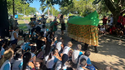 A primeira apresentação ocorreu na Praça Henrique Lage, no Centro, reunindo moradores de diferentes idades. Em “Dona Bilica e o Boi de Mamão”, o público acompanhou uma encenação dinâmica, com referências diretas ao folclore catarinense. A mistura de música, humor e personagens tradicionais criou um ambiente descontraído e aproximou ainda mais a plateia da história.