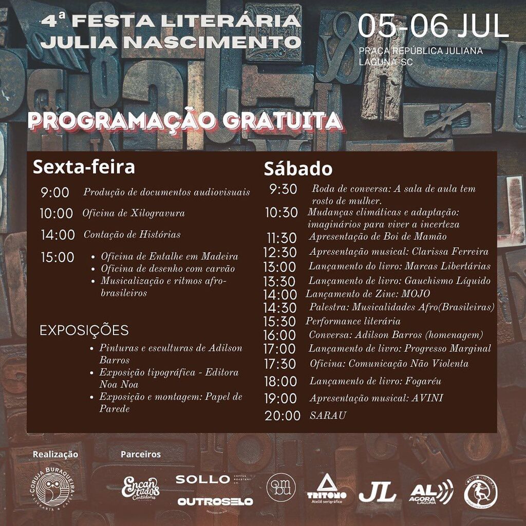 Foi divulgada a programação da quarta edição da Festa Literária Júlia Nascimento (FliJun). O evento, organizado pela Livraria Coruja Buraqueira, acontecerá na Praça República Juliana, centro de Laguna, nos dias 6 e 5 de julho (sexta e sábado). A festividade contará com uma mescla de várias formas de valorização da cultura.