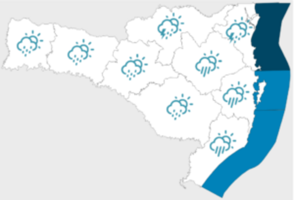 Nas regiões do Baixo Vale do Itajaí, Litoral Norte e do Planalto Norte, é esperada ocorrência de pancadas de chuva que podem vir em forma de temporais isolados com raios, rajadas de vento, eventual queda de granizo, alagamentos e deslizamentos, devido aos volumes de chuva mais expressivos esperados para o turno da noite.