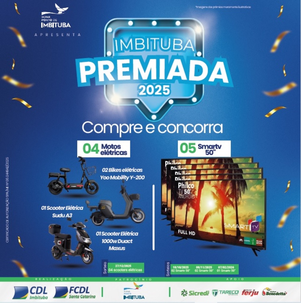 A Promoção Imbituba Premiada 2025 é uma realização da CDL Imbituba, com o apoio da FCDL SC, com a participação de quase 100 lojas do comércio local, reforçando o incentivo às compras no município. A ação conta com o patrocínio da SCPAR Porto de Imbituba, Sicredi, Tareco Automóveis, Ferju e Auto Posto Benedetta.