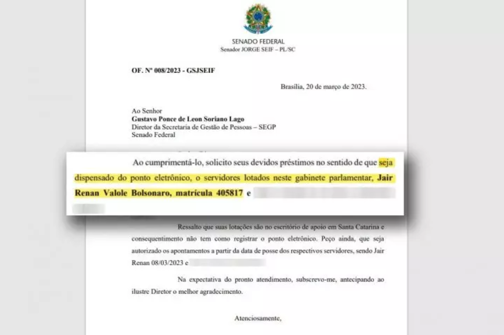 O filho de Bolsonaro exerce o cargo sem precisar “bater o ponto”. A presença no trabalho pode ser abonada por seu superior direto no gabinete, algo permitido no Senado desde 2017, quando foi publicado o APS (Ato da Primeira Secretaria) número 2. O artigo 23 diz o seguinte:
