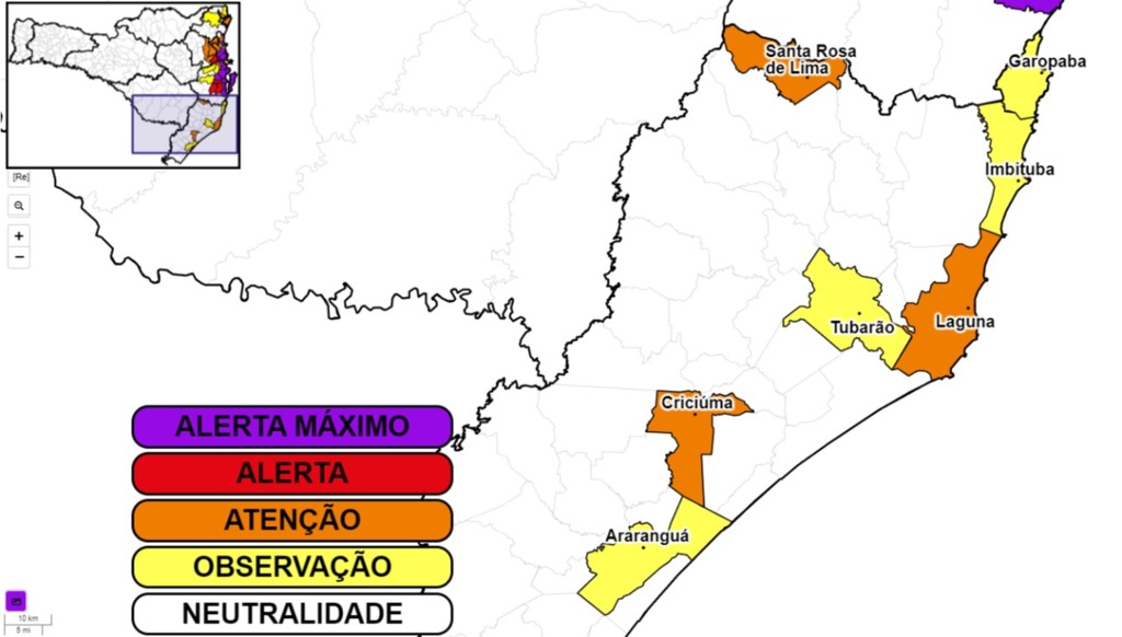 A Defesa Civil estadual divulgou que a chuva deve persistir em todo o estado catarinense. As áreas do Litoral Norte, Norte e parte do Vale do Itajaí são as que mais possuem riscos de estragos, seguidos pela Grande Florianópolis e parte do Sul. O risco é moderado para a Serra e Oeste.