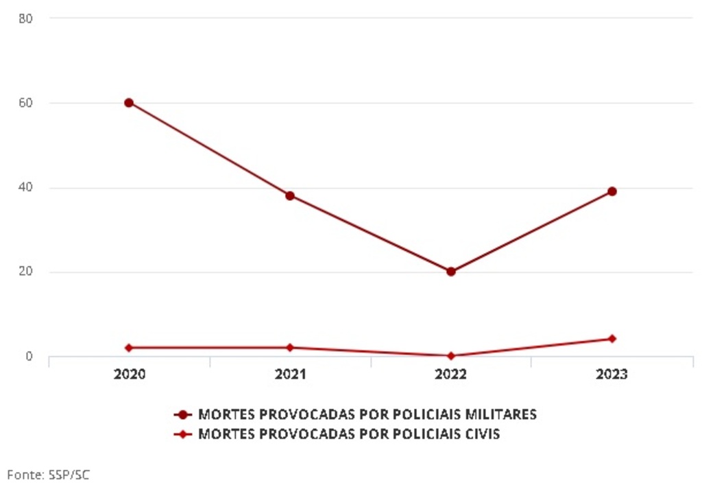 As mortes cometidas por policiais civis ou militares em Santa Catarina aumentaram 115% no 1º semestre de 2023 em comparação ao mesmo período do ano passado. Entre 1º de janeiro e 30 de junho, foram 43 óbitos, contra 20 nos seis primeiros meses de 2022. As ocorrências são classificadas pela Secretaria de Segurança Pública (SSP) como Mortes Decorrentes de Intervenção Policial (MDIP).