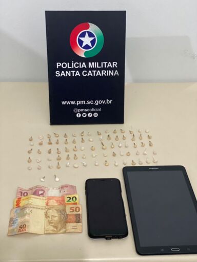 Foi localizado na residência do suspeito: 2 petecas de cocaína; 75 pedras de "crack "; 1 aparelho tablet; 80 reais; e 1 celular.